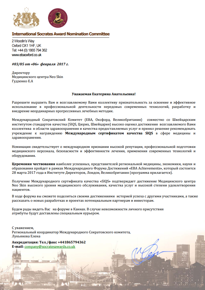 Будет проведена церемония чествования наиболее успешных, представителей региональной медицины, экономики, науки и образования пройдет в рамках Международного Форума Достижений «EBA Аchievements», который состоится 28 марта 2017 года в Институте Директоров, Лондон, Великобритания. Получение Международного сертификата качества «SIQS» подтверждает достижение Медицинского центра Neo Skin высокого уровня медицинского обслуживания, качества услуг и высокой степени удовлетворения пациентов.